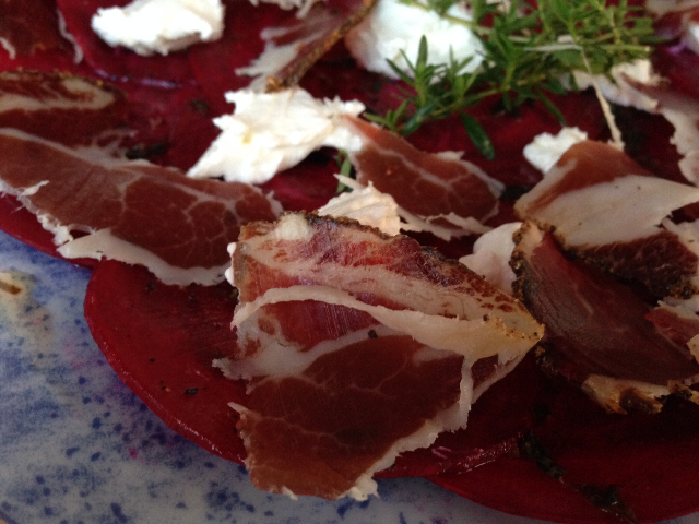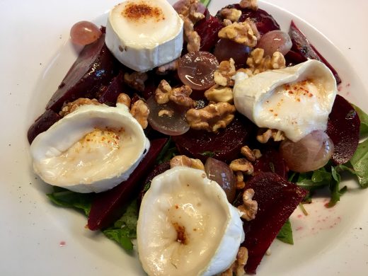 Zutaten für 2 Personen: 1 Rote Bete 3 El Apfelessig oder besser Saft von einer Amalfi Zitrone 1 El Honig Salz Pfeffer 3 El Öl 6 Stiele Thymian 75 g Ziegenfrischkäse 50 g Schinken...