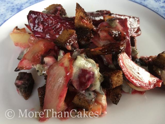 Zutaten für 2 Personen: 500 g kleine Rote-Bete-Knollen 1 große Zwiebel Olivenöl Salz Pfeffer 1 Tl getrockneter Thymian 2 El Balsamicocreme 1 Scheibe dunkles Roggenbrot Butter Chilipulver Zimtpulver 100 g Blauschimmelkäse Zubereitung: Backofen auf...