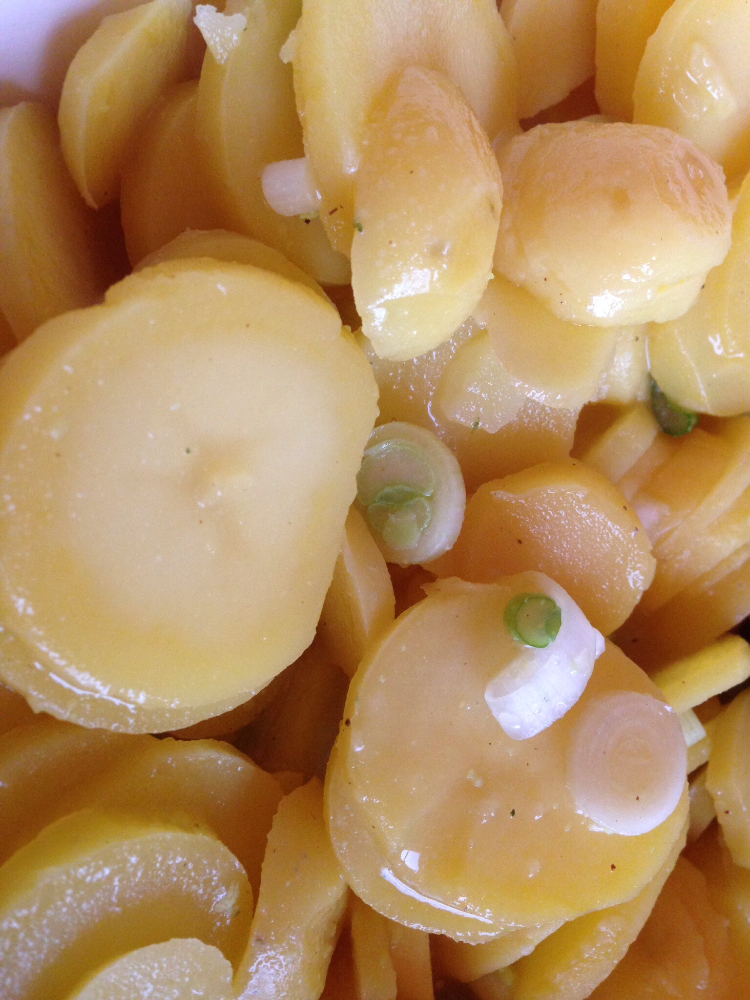 Zutaten für 4 Personen: 600g festkochende Kartoffel 125 ml Fleischbrühe 2 EL Sonnenblumenöl 3 El Weissweinessig 1 Tl Senf 1 Zwiebel oder 1/2 Bund Frühlingszwiebel 2 El Petersilie 1 Prise Zucker Pfeffer, Salz Zubereitung:...