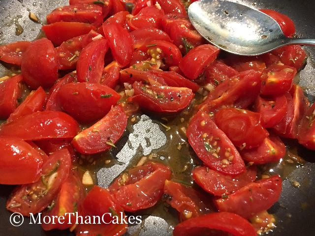 Zutaten: Cherrytomaten, halbiert oder geviertelt Knoblauchzehe, fein gewürfelt gehackte Rosmarinnadeln Olivenöl Zucker Salz Pfeffer Zubereitung: In einer Bratpfanne etwas Olivenöl erhitzen und den Knoblauch anbraten. An den Rand schieben und 1 El Zucker in der...
