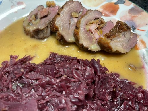 Zutaten für 4 Personen: 1 doppelte Gänsebrust ohne Knochen (ca. 700 g) Salz Pfeffer Schnur 2 El getrocknete und gehackte Cranberries 2 Tl körniger Senf 2 El gehackte Walnüsse Geflügelpaste von Lacroix Wasser 1/2...