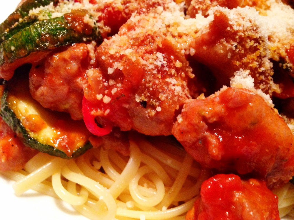 Zutaten für 4 Portionen: 400 g Spaghetti 2-3 mittelgroße Zucchini 400 g Salsiccia (italienische grobe Bratwurst) 1 Zwiebel 2-3 Knoblauchzehen 1 Chilischote 1 EL Tomatenmark 1 Dose geschälte Tomaten (400g) 2 EL Kapern Olivenöl...