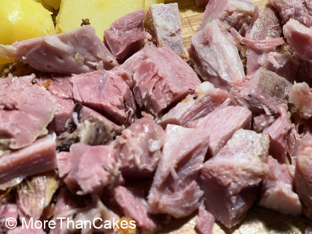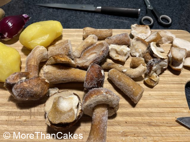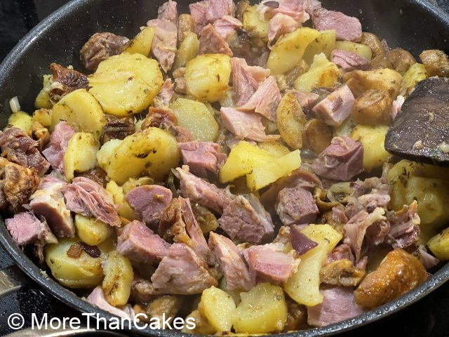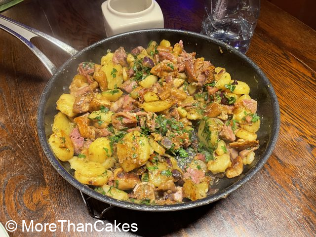 Die Zwiebel in kleine Würfel schneiden. Due in Scheiben geschnittenen Steinpilze in einer großen Pfanne in Butter anbraten. Die Zwiebel 🧅 hinzugeben und mitbraten. Die Kartoffeln in Scheiben schneiden und in die Pfanne geben, alles gemeinsam gut anrösten und mit Salz, Pfeffer, Kümmel und Majoran abschmecken. Nun das in mundgerechte Stücke geschnittene Haxenfleisch hinzugeben und ebenfalls rösten.