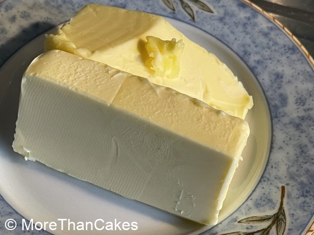 Schneiden Sie die Teigplatte in 6 Streifen und legen Sie jeweils drei Scheiben aufeinander, wobei der oberste Streifen mit der Butterseite nach unten liegen muss.