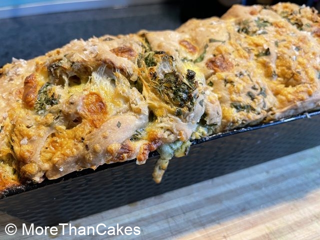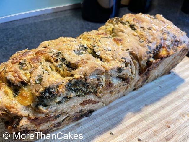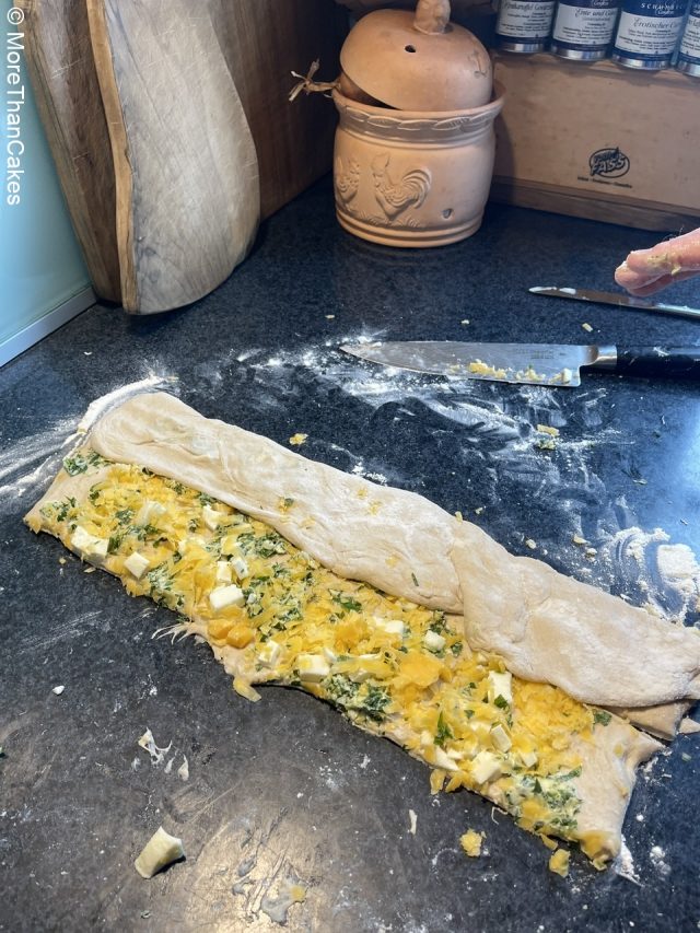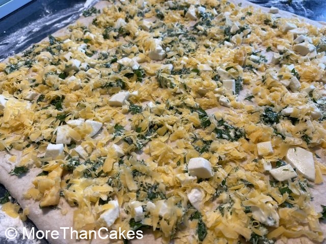 Kneten Sie den Hefeteig noch einmal auf einer bemehlten Arbeitsfläche durch und rollen Sie ihn dann zu einem Quadrat (etwa 50×50 cm) aus. Bestreichen Sie die Teigplatte mit der Knoblauch-Kräuter-Butter und streuen Sie dann den Käse gleichmäßig darauf.