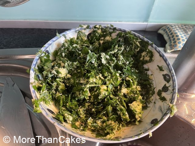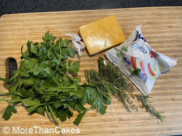Schälen Sie die Knoblauchzehen und hacken Sie sie sehr fein. Zupfen Sie die Blätter und Nadeln von Thymian und Rosmarin ab und hacken Sie diese wie die Petersilie ebenfalls fein. Rühren Sie den Knoblauch und die Kräuter in die weiche Butter. Reiben beziehungsweise hacken Sie die beiden Käsesorten fein.