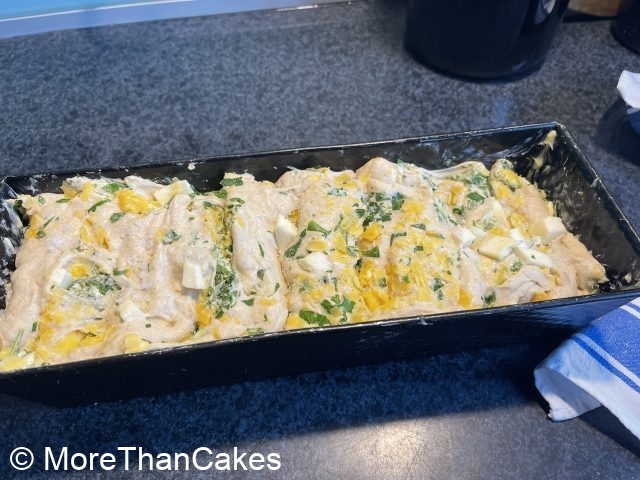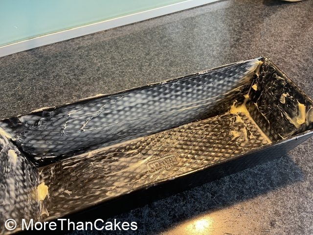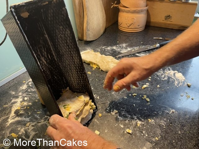 Fetten Sie eine Kastenform gut ein, stellen Sie auf und stapeln Sie dann die Teigstücke übereinander hinein.