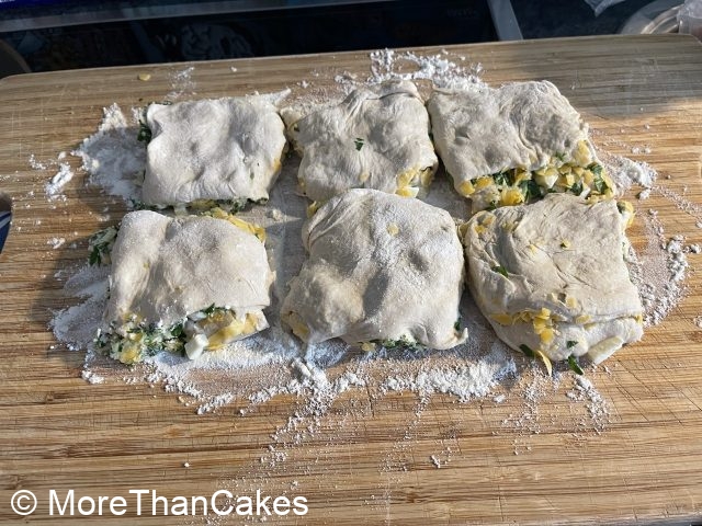 Diese zwei Dreierstapel schneiden Sie dann in je sechs gleichmäßige Stücke.