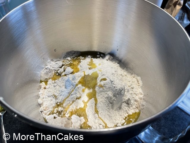 Mischen Sie dann das Mehl mit einem Tl Salz und fügen Sie das Hefewasser sowie 250 ml Wasser und 3 El Olivenöl dazu.